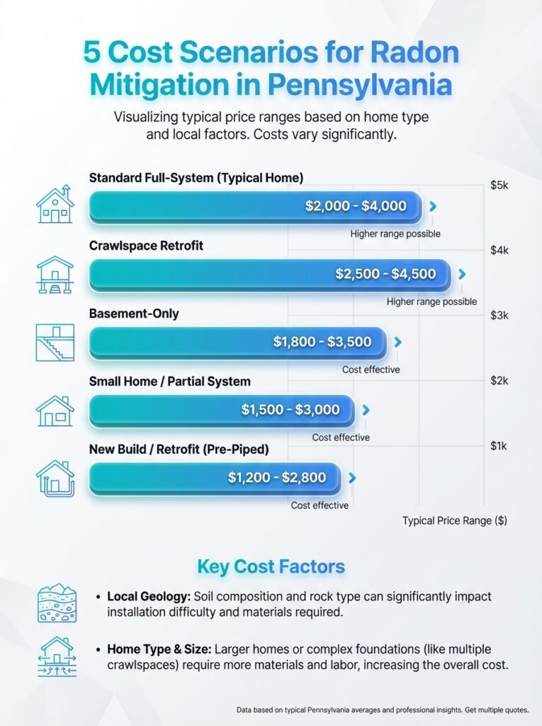 This infographic breaks down five potential costs for radon mitigation in Pennsylvania, helping homeowners compare options. See which scenario fits your budget and home health priorities.